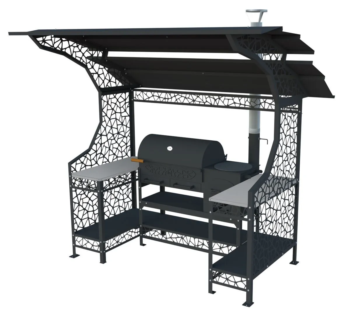 - сборной конструкции (с двухуровневой крышей, двумя столиками из нержавеющей стали 1,0мм по бокам, центральной нижней полкой и двумя полками расположенными по бокам) с резными элементами с ребрами жесткости собирающихся.