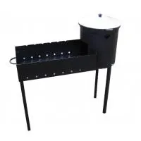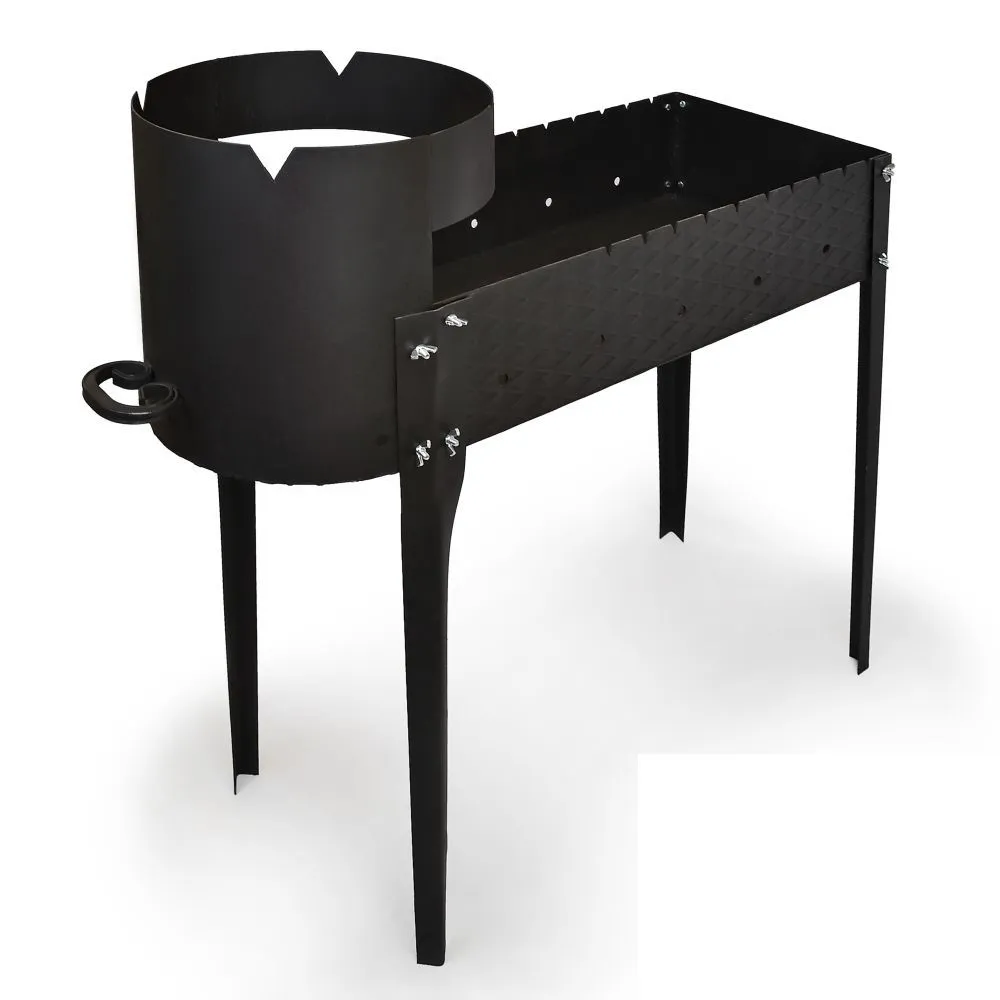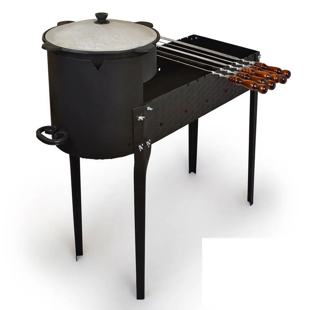Печь под казан диаметром 36 см подходит к казанам 8-12 литров. Казан в печи крепко закрепляется. Высота от земли до края печи под казан 87 см. При приготовлении вам будет удобно готовить блюдо в казане. Общая длина мангала с ручками 93 см. Благодаря тому, что ножки легко отсоединяются, он помещается в легковой автомобиль.